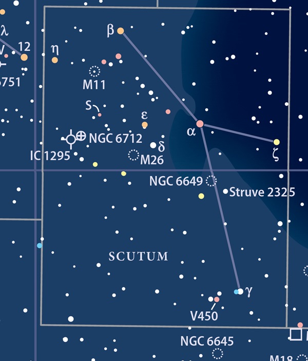 With the Moon rising later and later, there’s a great dark-sky window this evening to explore the small constellation Scutum in the south. It’s located just southwest of 3rd-magnitude Lambda Aquilae, which marks Aquila’s tail.