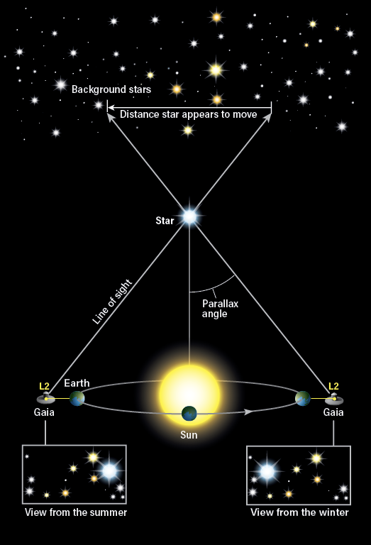 From its position at Earth’s L2 point, Gaia circled the Sun once a year along with our planet. As it did so, its position changed by some 186 million miles (300 million km) over the course of a year. By observing the same stars while on opposite sides of the Sun, Gaia used a technique called parallax to determine their distance.