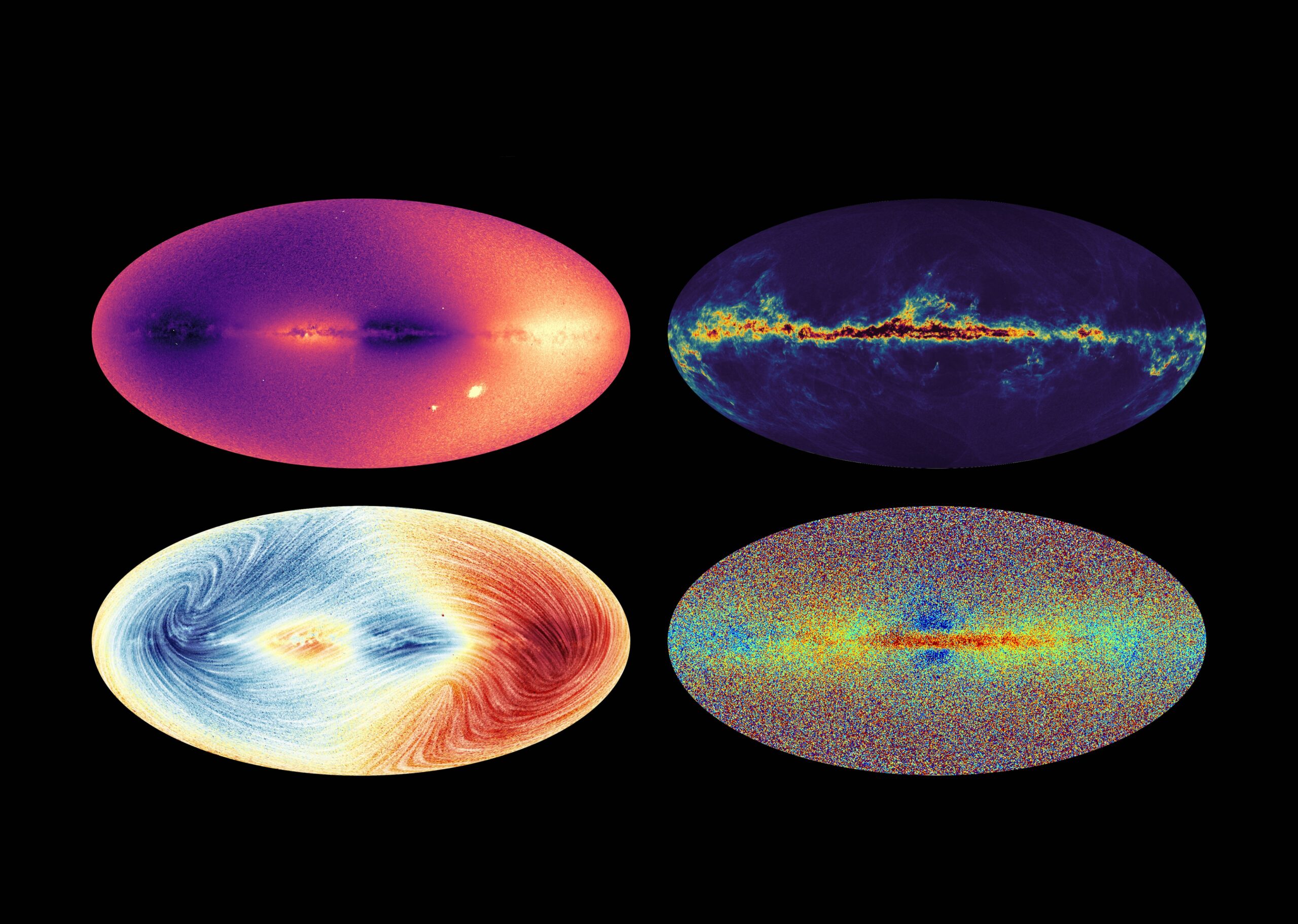 These four sky maps show off Gaia data released in June 2022 (Data Release 3). At upper left, a map of radial velocity shows the motion of stars toward or away from Earth, with darker colors moving toward us and brighter colors moving away from us. The map below it (lower left) also shows motion toward (blue) and away (red) from Earth, this time combined with stars’ proper motion — their projected motion across the sky — shown as the white lines. This combination of details allows astronomers to see how stars in different parts of the galaxy are moving in both speed and direction. The oval at upper right is Gaia’s map of interstellar dust in our galaxy, showing not starlight but where that light is absorbed. Blacker regions along the center — the plane of the Milky Way — indicate more absorption (and more dust), while brighter colors show where there is less absorption (and less dust). The dark blue regions at the top and bottom of the oval map show where there is very little dust. At bottom right is a chemical map of the Milky Way, revealing stars that contain higher concentrations of metals (redder colors); bluer colors are stars with fewer metals. Astronomers consider any elements heavier than hydrogen and helium to be metals. Older stars have fewer metals than more recent generations of suns.