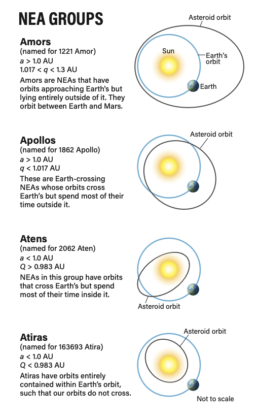 NEOs, which include NEAs, are asteroids or comets that orbit the Sun with a perihelion, or closest point to the Sun, of 1.3 astronomical units or less. (One astronomical unit, or AU, is the average Earth-Sun distance of 93 million miles [150 million km].) If an asteroid exceeds 460 feet (0.09 mile; 140 m) in width and comes within about 4.6 million miles (7.5 million km; 0.05 AU) of Earth’s orbital path, it is designated a potentially hazardous asteroid (PHA), capable of widespread destruction.