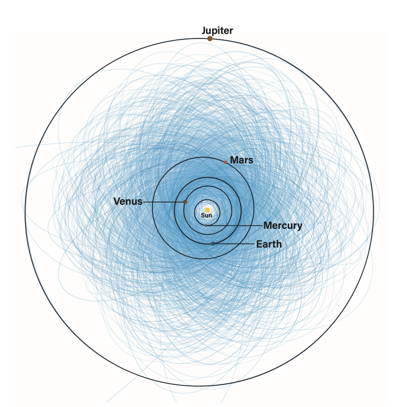 For Chodas, the real challenge is determining trajectories, not numbers. He has been predicting the motions of asteroids and comets with pinpoint accuracy for decades. Chodas is also tasked with inventing the fictional asteroids for Planetary Defense Conferences — a biennial forum for thwarting hypothetical killer space rocks, akin to war games for astronomers and engineers.