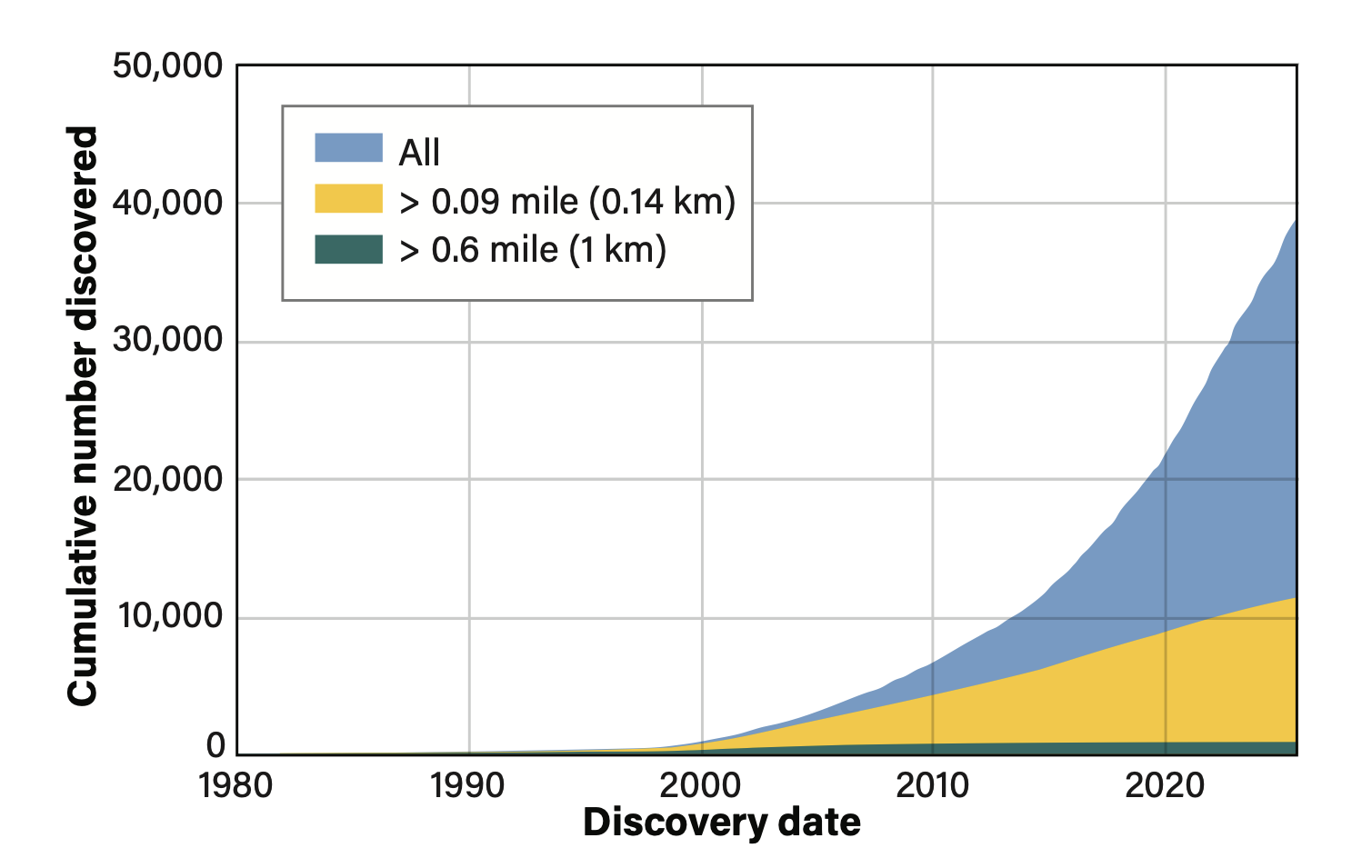 That’s because determining how many total NEAs exist is tricky. “The percentage of NEAs that have been discovered so far depends tremendously on size,” Chodas explains. “I give the example of a bunch of fish in a small lake. The fish are like asteroids. When you go fishing, you tag them as you catch them [and] throw them back in. You do this day after day, and after a month or two, when 90 percent of the fish you’re catching are tagged, you know you’ve found 90 percent of the population. But the smaller the size limit you’re interested in, the larger the population, and the smaller the completion ratio.”