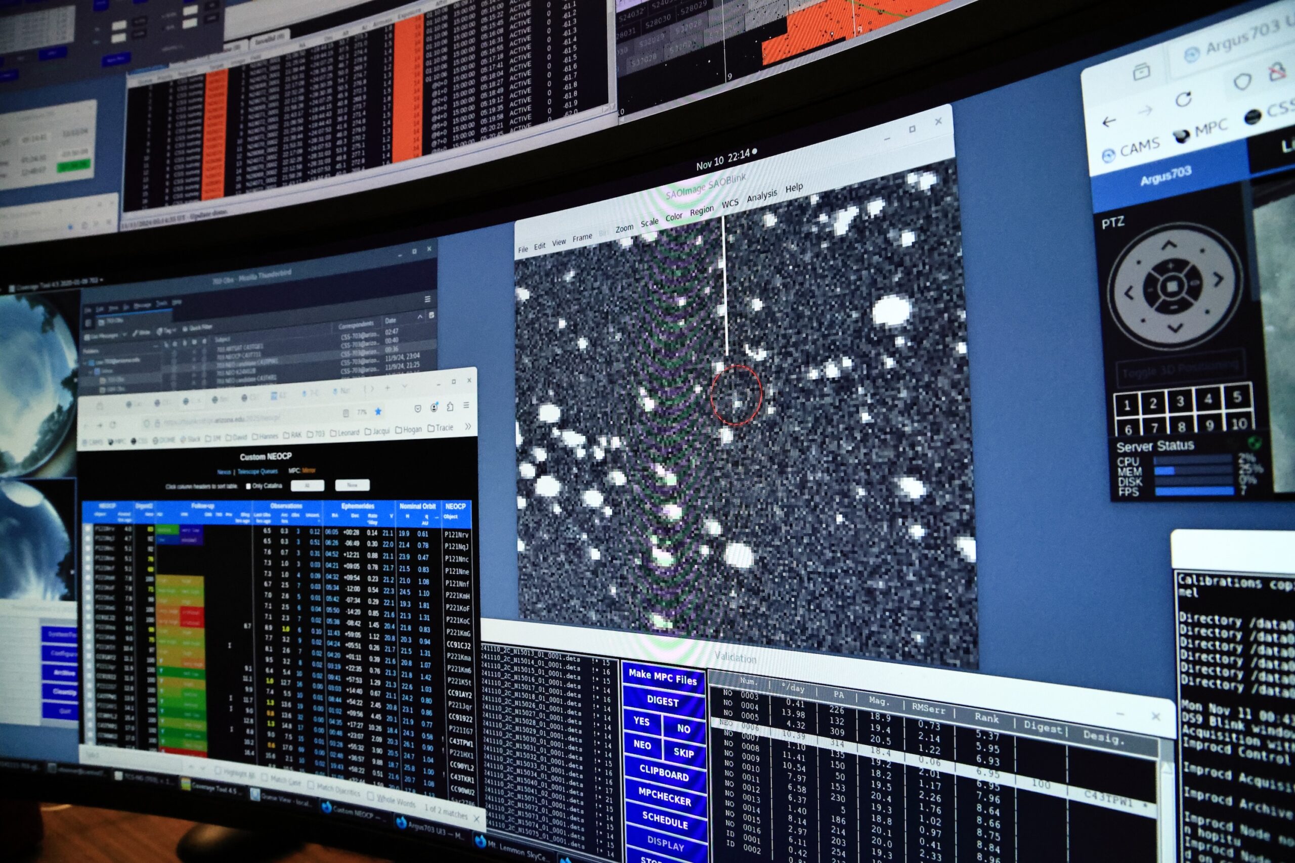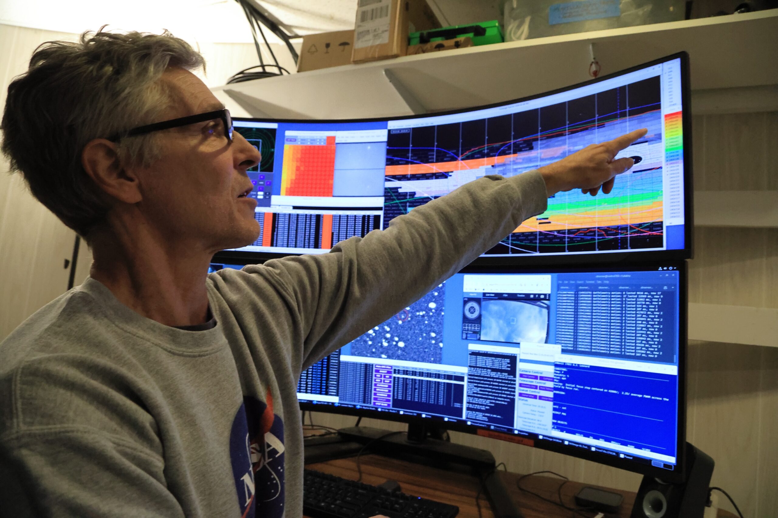 “I spotted three candidates just last night [Nov. 9, 2024],” Leonard says, pointing to a sweep of monitors in the cramped control room. One screen displays a colorful chart that tracks the motions of the telescope whirring above us — 14-second exposures, repeated four times each, covering hundreds of fields, or roughly half the sky, per night. Imagery is constantly processed while the telescope slews — it takes 10 minutes from exposure to completion. Another telescope 4 miles (6.4 km) away atop Mount Lemmon specializes in dimmer objects — down to magnitude 22, a million times fainter than our eyes can see — and takes two weeks to cover half the sky.