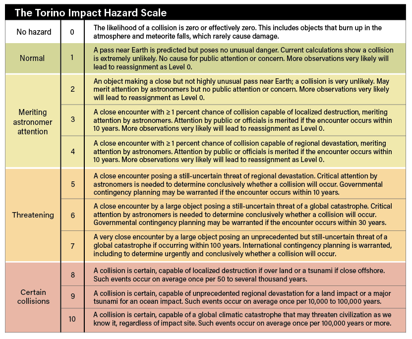 Astronomers rate asteroid risk on the 10-point Torino Impact Hazard Scale, which uses colored tiers. White (0) and green (1) indicate effectively no chance of collision or a chance so small that it is of no concern. Yellow (2–4) designates asteroids with more than a 1 percent chance of collision, capable of inflicting localized destruction and warranting attention if the encounter will occur within a decade. Orange (5–7) identifies objects that pose a serious threat of regional destruction, with different levels warranting attention depending on the timing of the encounter (ranging from 10 to 100 years). Red (8–10) encompasses all definite collisions capable of causing destruction within any amount of time. Level 10, the highest rank on the scale, is reserved for extinction-level threats