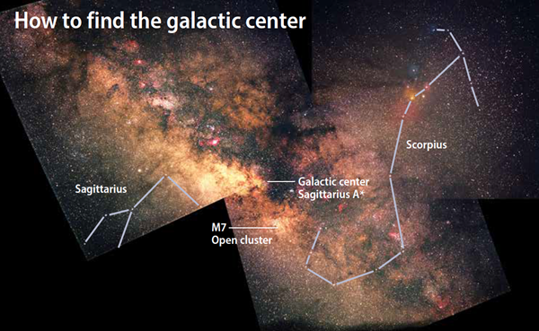 The galactic center lies about 26,000 light-years from Earth toward the constellation Sagittarius. It is a region of the sky where bright stars mingle with dark clouds of gas and dust. The actual center is too obscured to reveal much when astronomers observe it in visible light. What we know of it comes from data collected in infrared and radio wavelengths. These wavelengths can pass through the dust and gas and reach Earth-based telescopes.