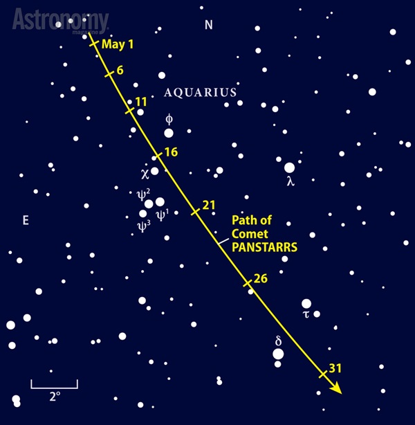 Observers across the contiguous United States and points south should have a nice 7th-magnitude comet to view through their telescopes on May mornings. The catch: Comet PANSTARRS (C/2013 X1) struggles to climb above the horizon haze before dawn breaks. You’ll need a clear, flat eastern horizon to spot PANSTARRS as it slides south through Aquarius.
