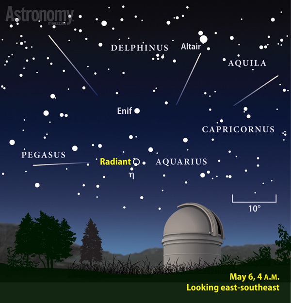 The shower peaks in North America the afternoon of May 5, so equally good views should come before dawn on the 5th and 6th. This coincides with New Moon — the only major meteor shower that can make this boast in 2016. From a dark site, you should notice 10 to 20 meteors per hour emanating from Aquarius. Observers in the Southern Hemisphere, where Aquarius passes nearly overhead, typically see the most meteors.