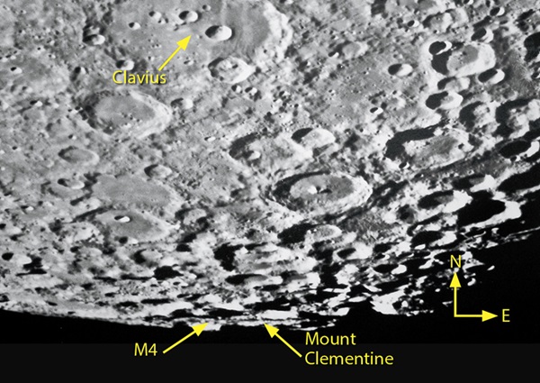 Elsewhere on the Moon, a rising Sun casts a mountain’s shadow to the west. But near the south pole, shadows gradually swing around in a circle. The modestly tall bump in front of Clementine first casts its shadow to the base of M4. It marches eastward on following nights, crossing the base of Clementine. A few nights later, M4 itself puts Clementine in darkness.