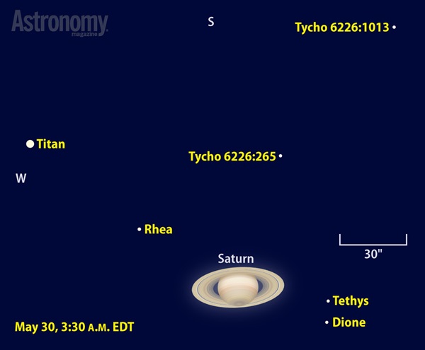 Not surprisingly, Saturn’s smaller moons glow more dimly. Tethys, Dione, and Rhea all shine at 10th magnitude and will show up through 4-inch instruments. They orbit closer to the planet than Titan and appear no more than 1′ from the edge of the rings. Don’t mistake these moons for two 10th-magnitude field stars that appear in the same general area the night of May 29/30.
