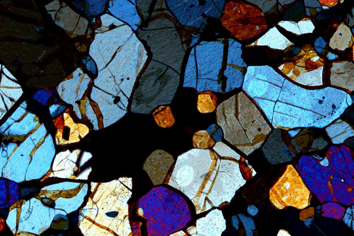 While the floor of the crater produced spectacular silver-colored specimens of metal, the overlying silicate-rich portion of the molten lake, far larger in volume, solidified separately. As it crystallized, the most abundant minerals to precipitate were pyroxene and olivine. Intermingled with the pyroxene and olivine were plagioclase feldspar crystals, remnant metal and sulfide that did not fully separate, and a suite of other minor minerals. It is a colorful mixture. When viewed through a petrographic microscope — a type of microscope that uses polarized light — the rock generates a stained-glass view of that 4.5-billion-year-old world. Such meteorites, now referred to as winonaites, are among the oldest planetary samples known.