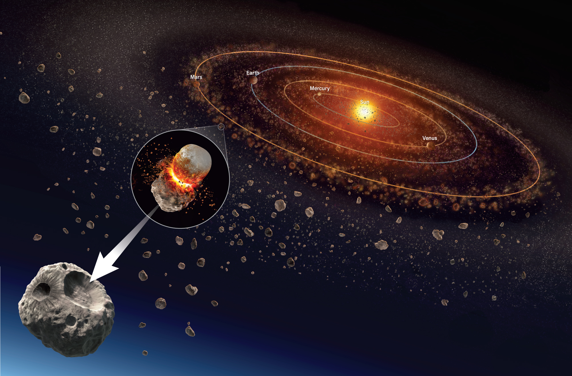 Other debris from the collisional evolution of the planetesimal still lurked in space. In particular, one fragment of the silicate-rich material that pooled and crystallized above the metal continued to zip around the Sun. That fragment eventually collided with another asteroid about 50 million years ago, exposing once-buried material to cosmic radiation.