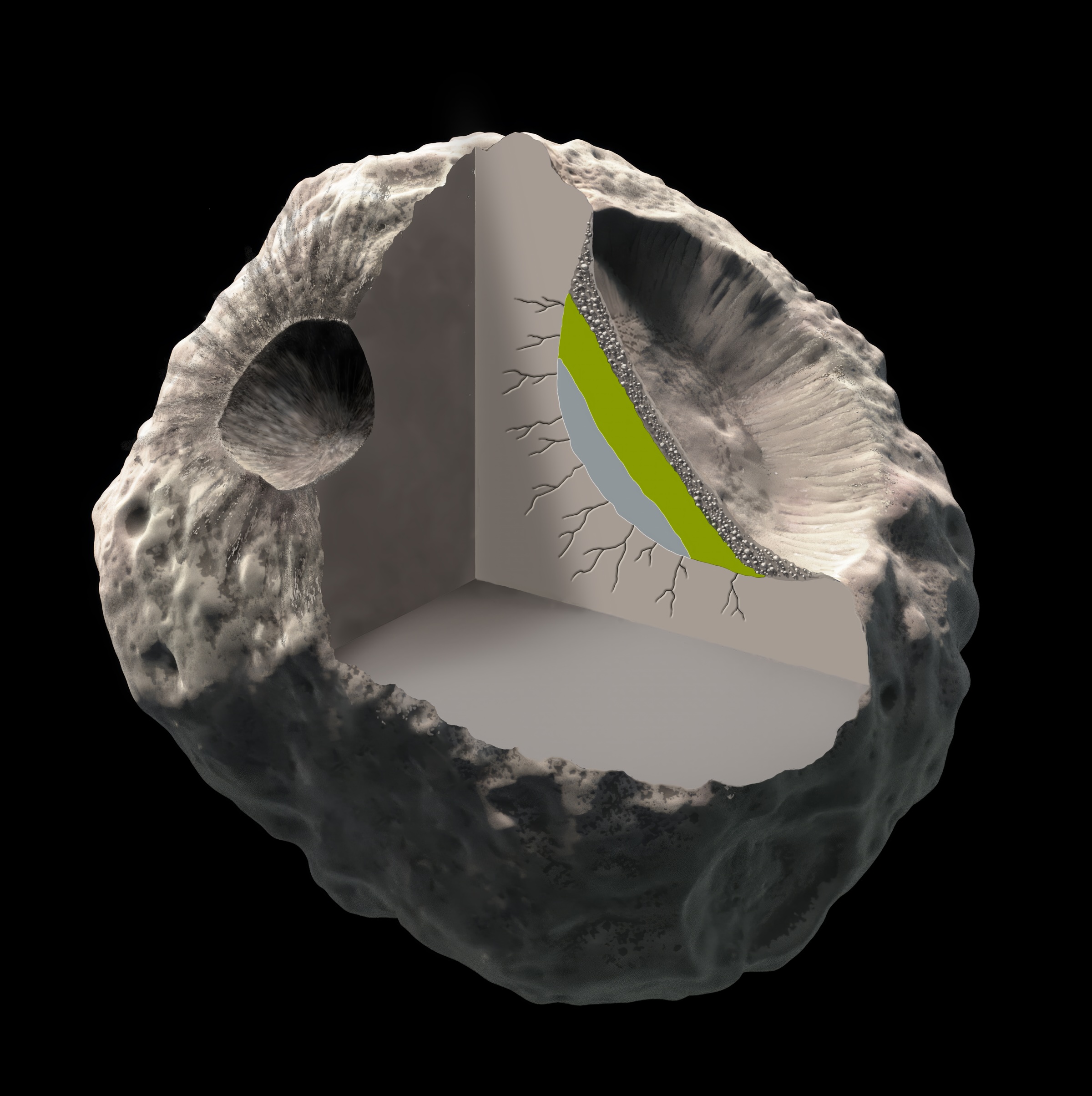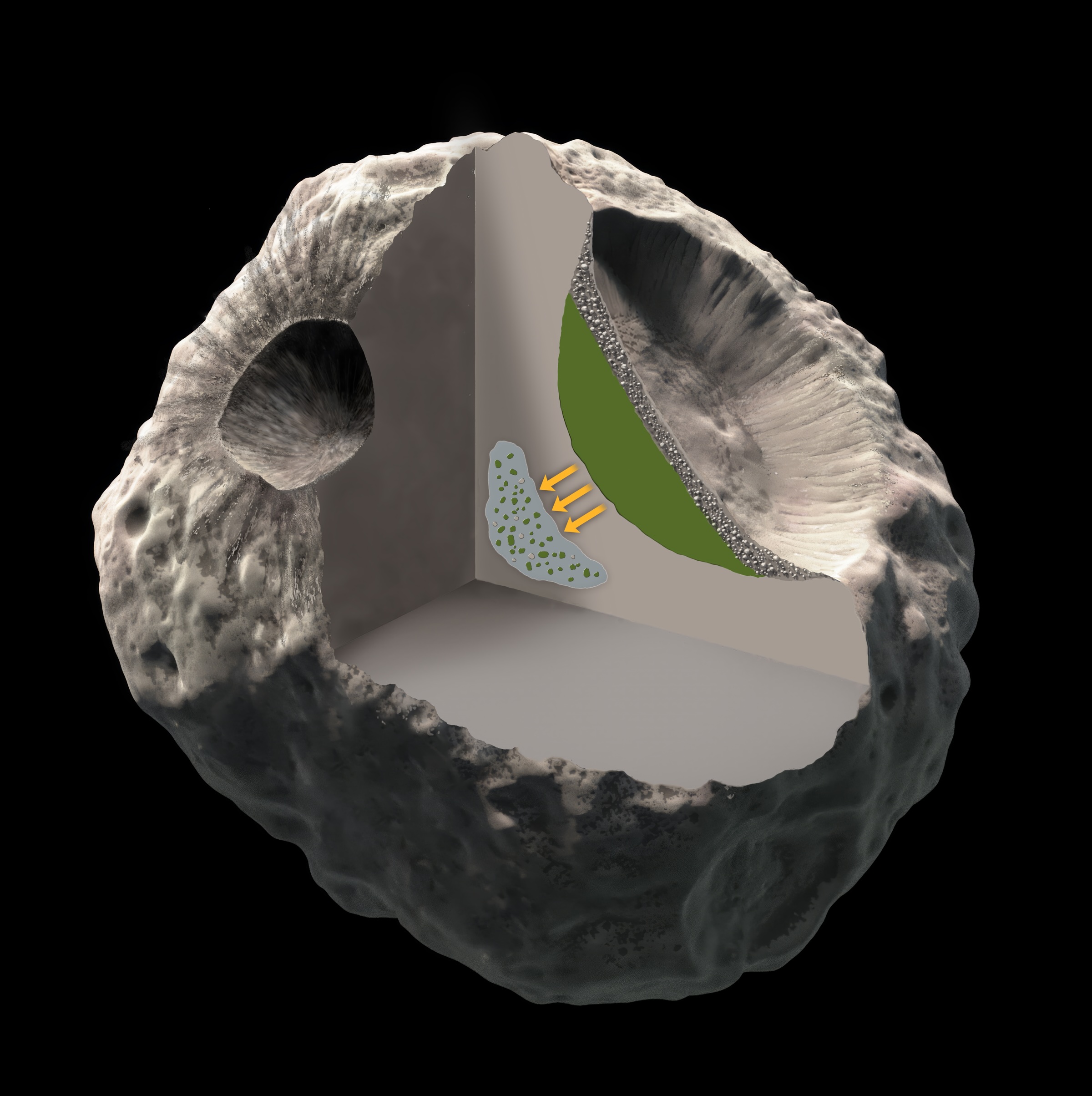 This crater cross-section depicts metal and sulfide as blue, pyroxene and olivine as green, and a gray blanketing layer of breccia rocks fallen back to the asteroid post-impact and from collapsed crater walls.