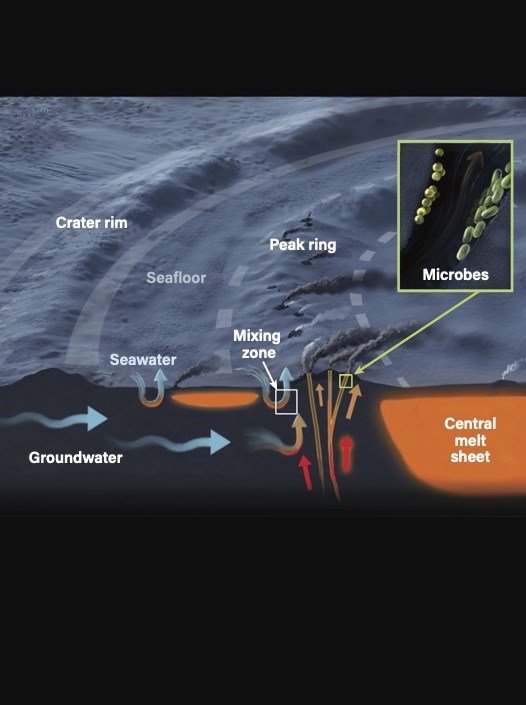 Following the impact, Chicxulub crater’s hydrothermal system was nearly 10 times larger than the Yellowstone caldera, spanning virtually the entire 112-mile-wide (180 kilometer) basin. But activity was especially intense near the peak ring inside the crater, which surrounded the central melt sheet. Groundwater flowed beneath the outskirts of the crater, taking advantage of porous, permeable rock created during the impact event. With temperatures exceeding 572 degrees Fahrenheit (300 degrees Celsius), this hot and mineral-laden water circulated up from depths as great as 3.1 miles (5 km).
