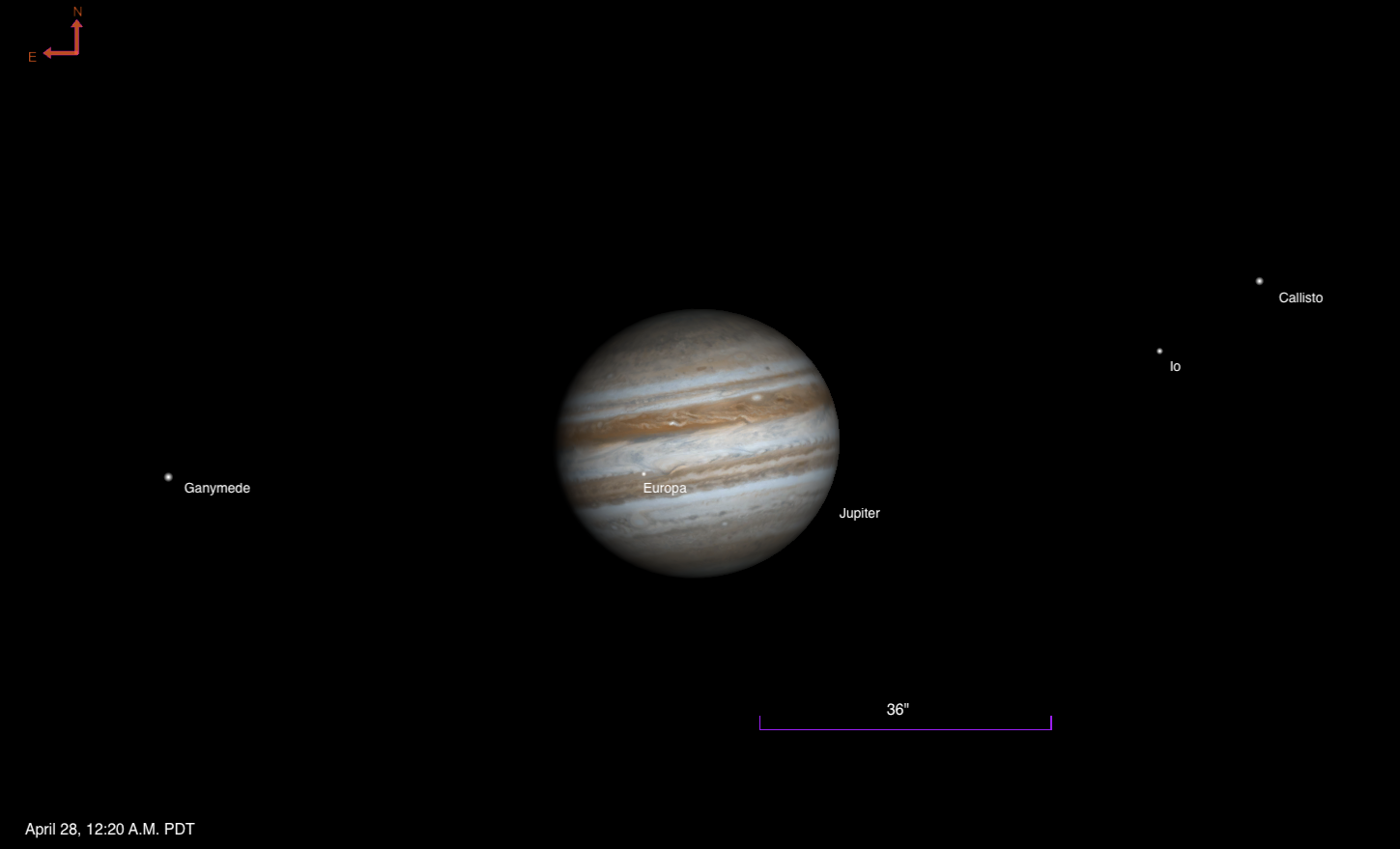 Meanwhile, Europa has begun to transit the planet, crossing the eastern limb around 12:30 A.M. MDT, visible in that time zone as well. Its shadow will follow, but not until after Jupiter sets even for those along the West Coast.