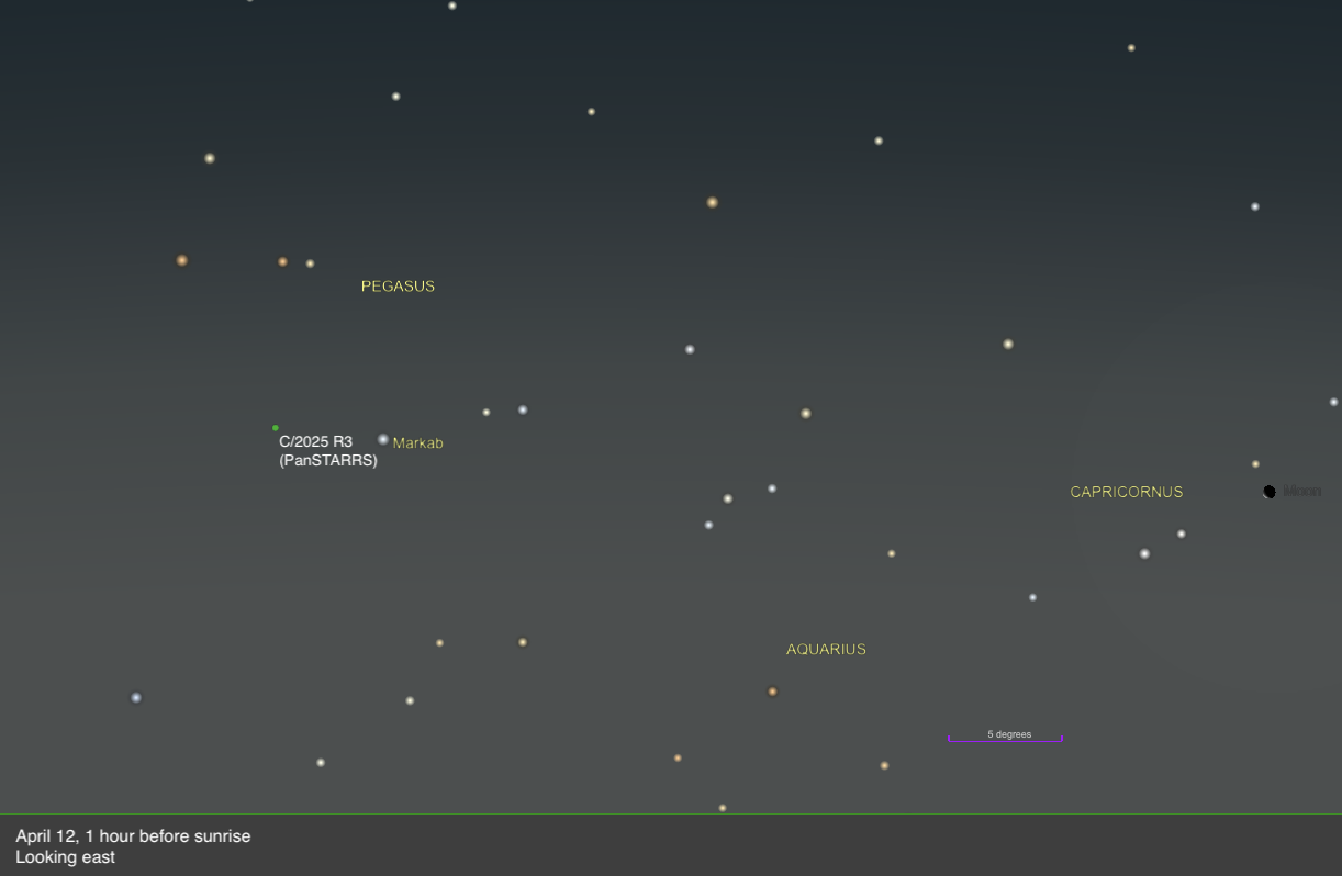 On April 12, the comet is near magnitude 2.5 Markab, Pegasus’ alpha star. As the Great Square rises, Markab makes up the point farthest right as the southwesternmost point of the Square. This morning, the comet is just 5.3° northeast of this star, rendering both visible in the same binocular field of view and offering a great signpost to find it.