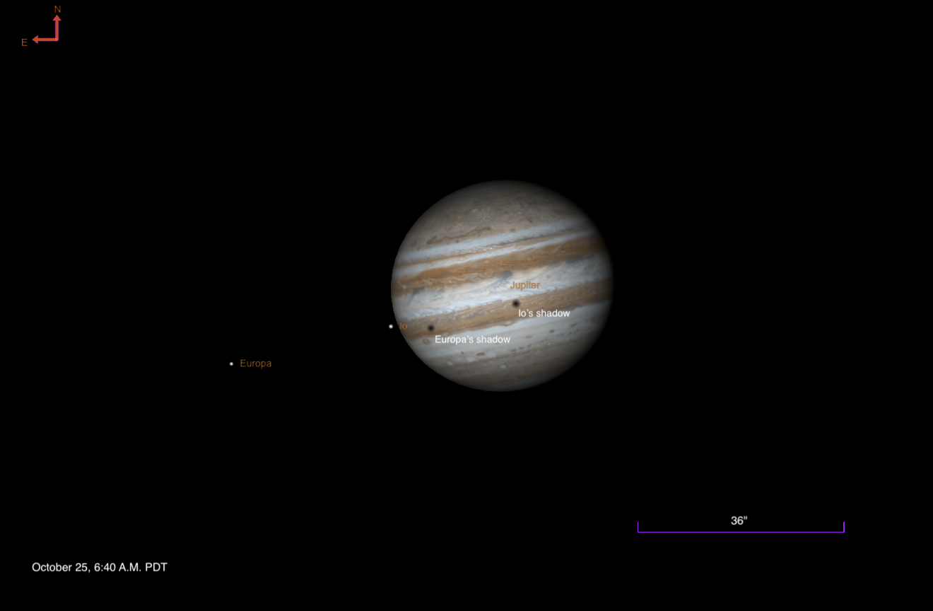 U.S. West Coast observers are in luck this morning, as Io and Europa cast their shadows together on Jupiter’s cloud tops as twilight is brightening the sky — an event that occurs after sunrise for the rest of the U.S.