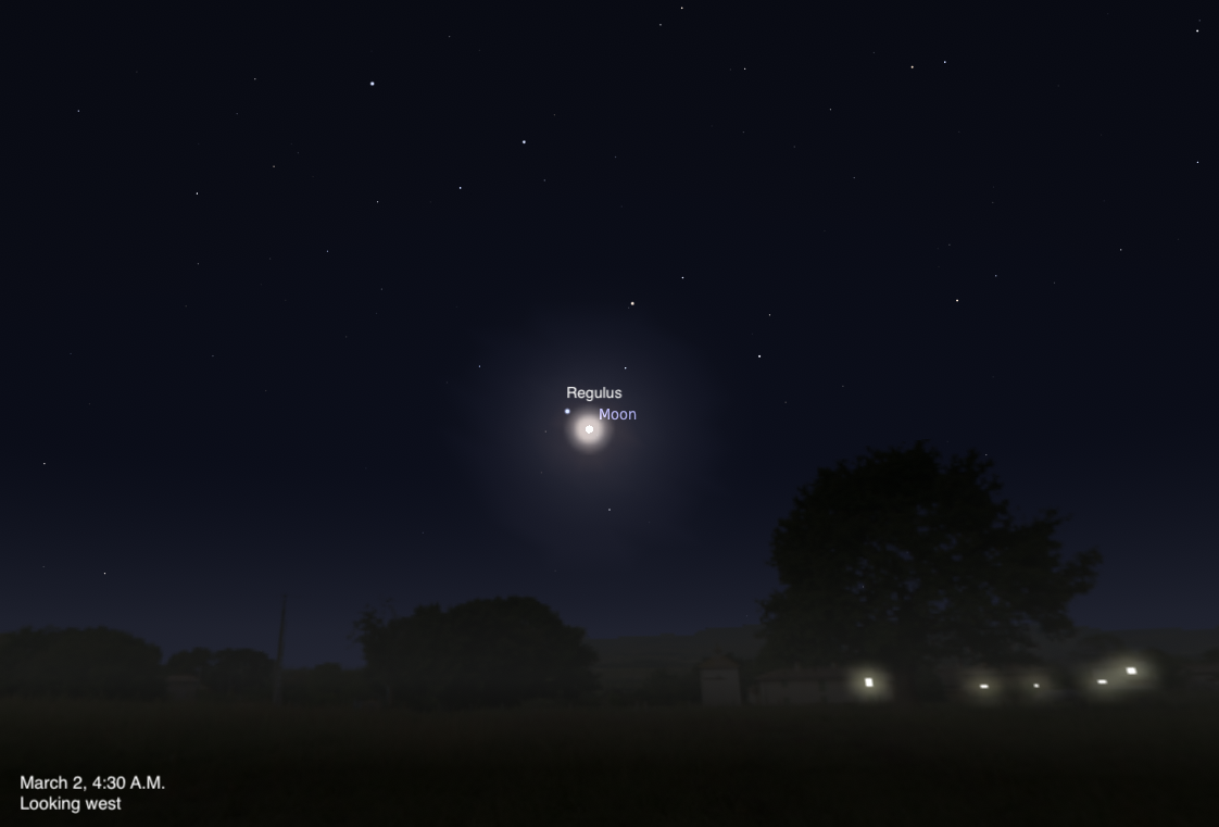 The nearly Full Moon passes just 0.4° north of Regulus at 8 A.M. EST on March 2; you can catch the pair close together in the predawn sky, standing roughly 20° high in the west two hours before sunrise. The Moon is located just to the lower right of Regulus, which anchors the famous Sickle asterism of Leo, which to many looks like a backwards question mark.