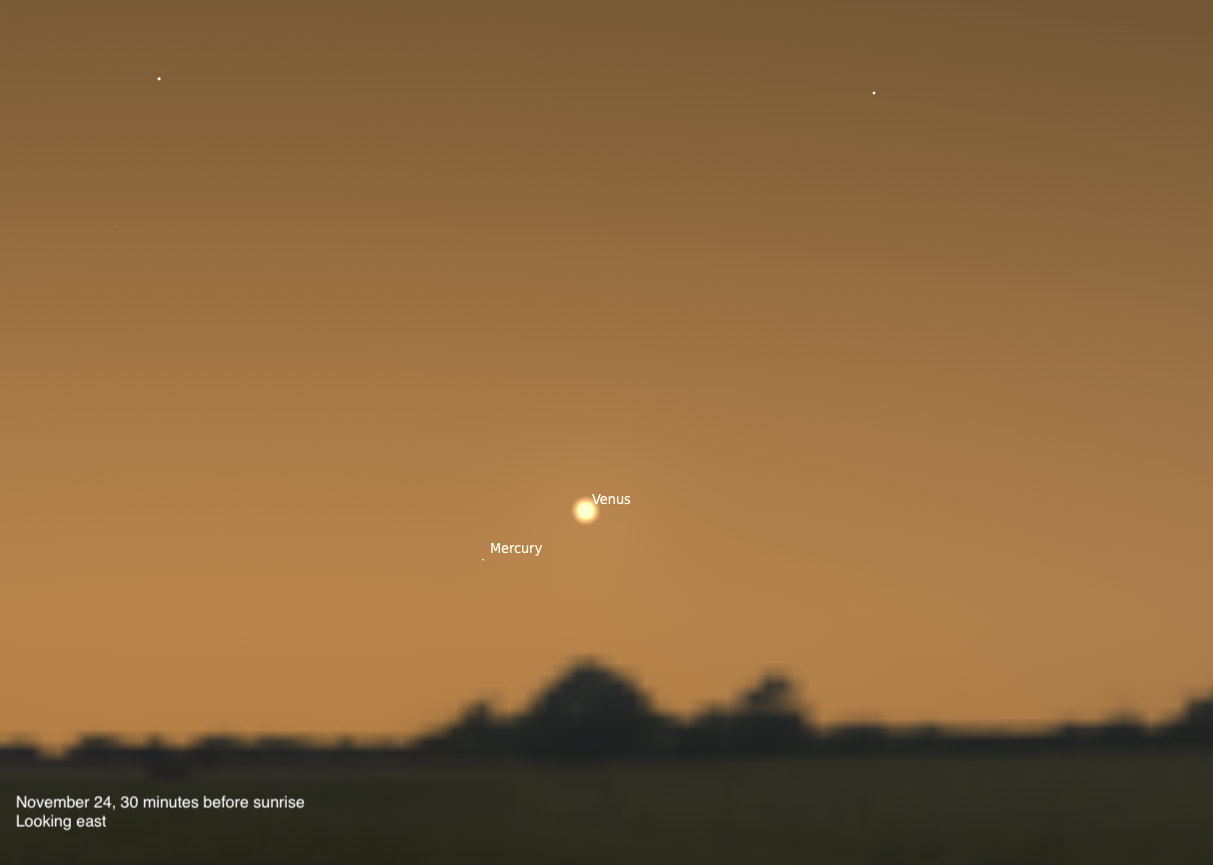 Venus and Mercury stand separated by 1.5° in the early-morning sky of November 24, visible in the east about half an hour before the Sun rises. The catch is that while bright magnitude –3.9 Venus is readily spotted with the naked eye, Mercury is only magnitude 2.9 and will need binoculars to spot.