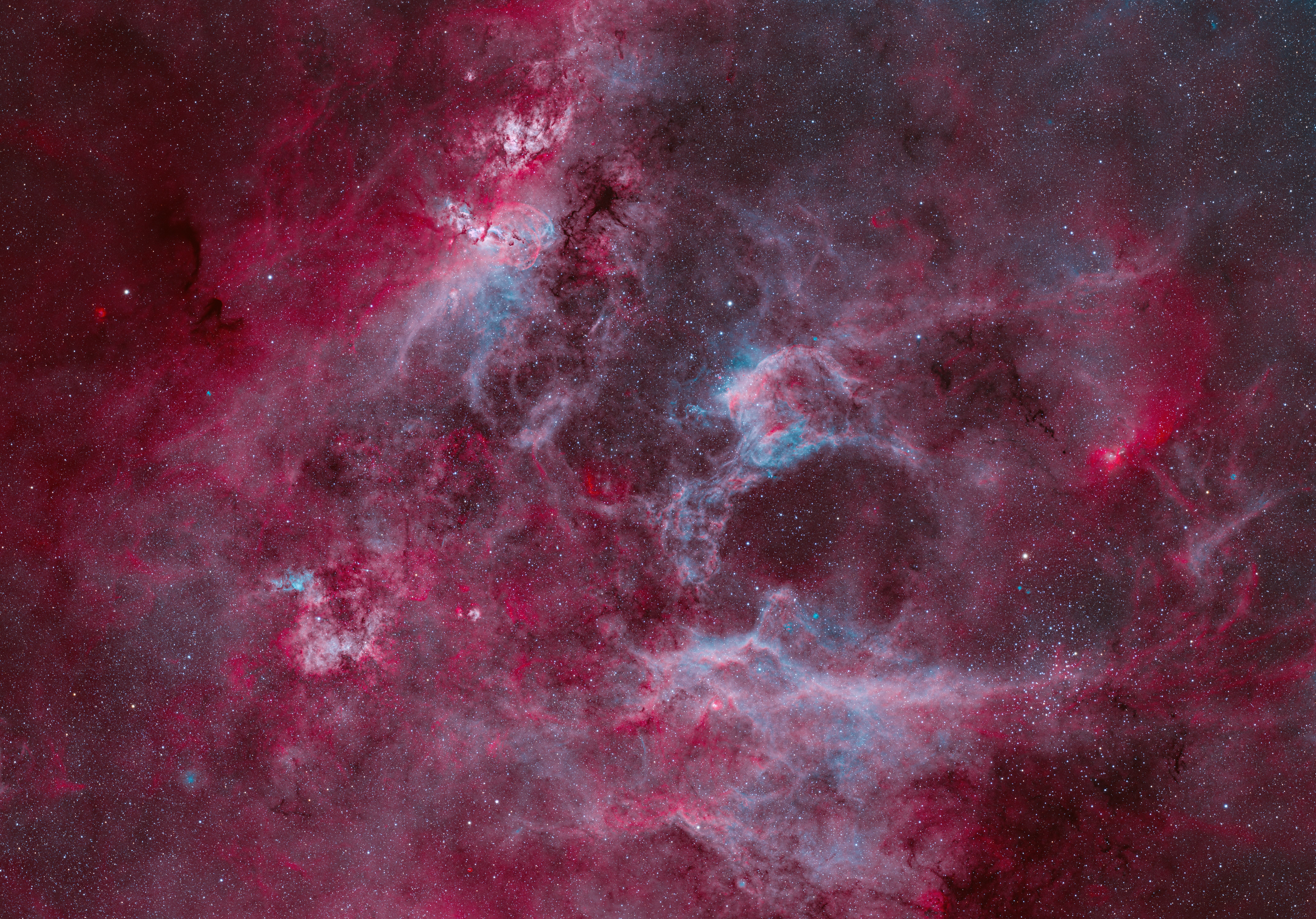 This collaborative effort captures a stunning wide-field vista in the constellation Carina. The image features a complex of emission nebulae, including the Statue of Liberty Nebula (NGC 3576), NGC 3603, NGC 3572, and NGC 3503. The trio of imagers combined forces to gather extensive narrowband and broadband data, revealing the delicate interplay of gas and dust in this southern sky region.