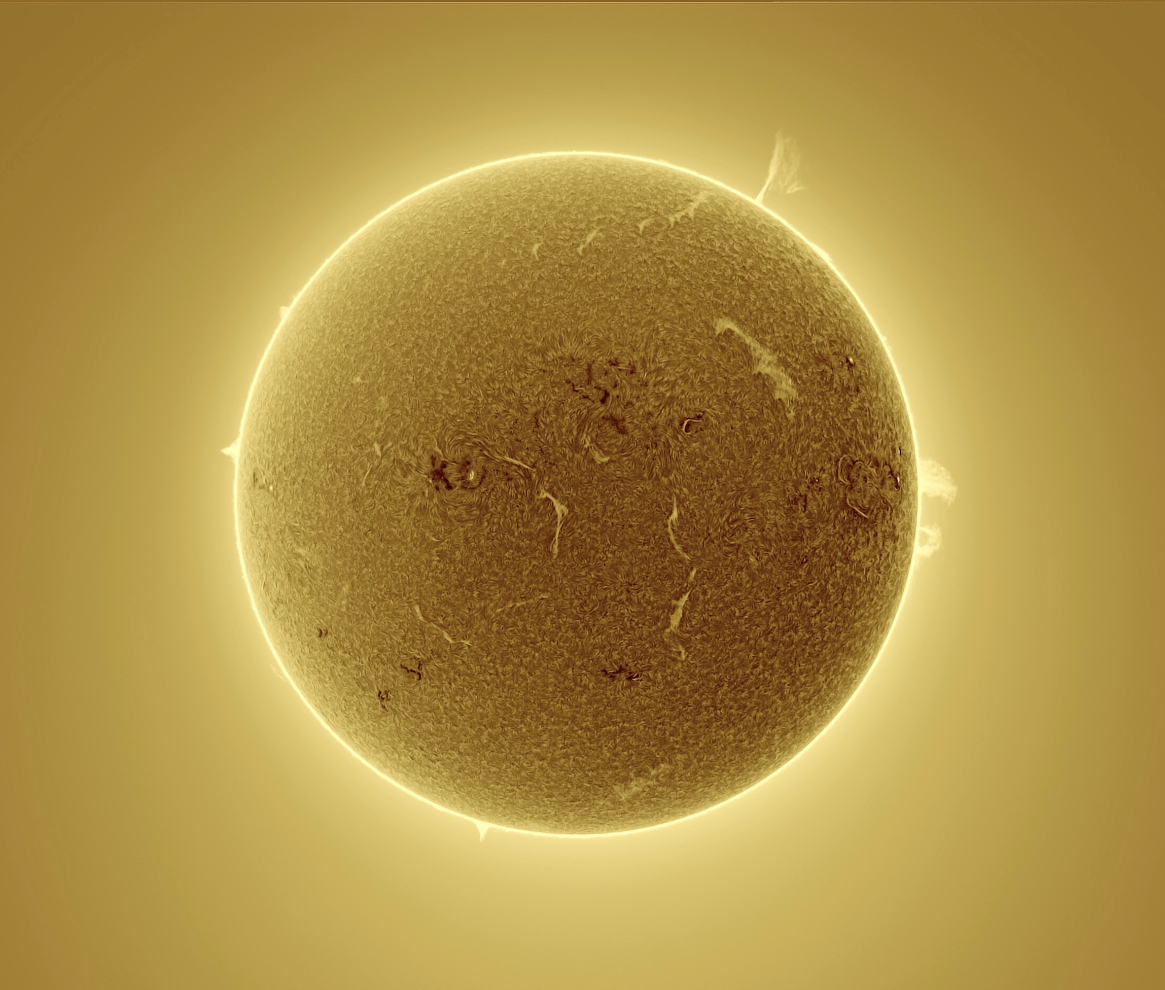 This hydrogen-alpha portrait reveals the turbulent nature of our nearest star. Captured from Alaska in late June, the image filters out the overwhelming brilliance of the photosphere to expose the swirling, textured chromosphere. Several prominences can be seen looping off the surface — including a massive feature in the top right estimated to be 93,200 miles (150,000 km) high.