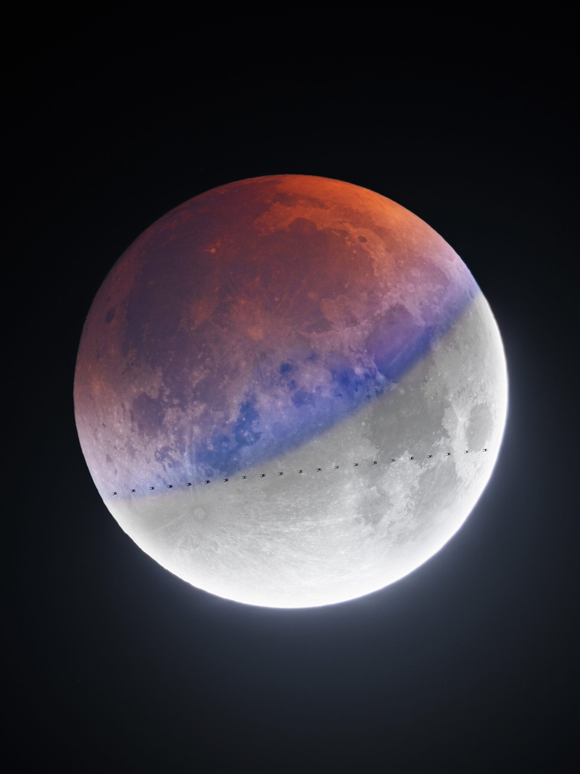 Tianyao Yang captured the Chinese space station Tiangong dashing across the face of the Moon while it was deep within Earth’s shadow. This HDR composite required careful planning to align with the station’s path, as the crossing itself lasted less than a second. The resulting image reveals the station’s distinct shape silhouetted against the Moon, orbiting roughly 372 miles (599 km) overhead. According to Yang, this is likely the first time such an event has been captured using HDR techniques during an eclipse.