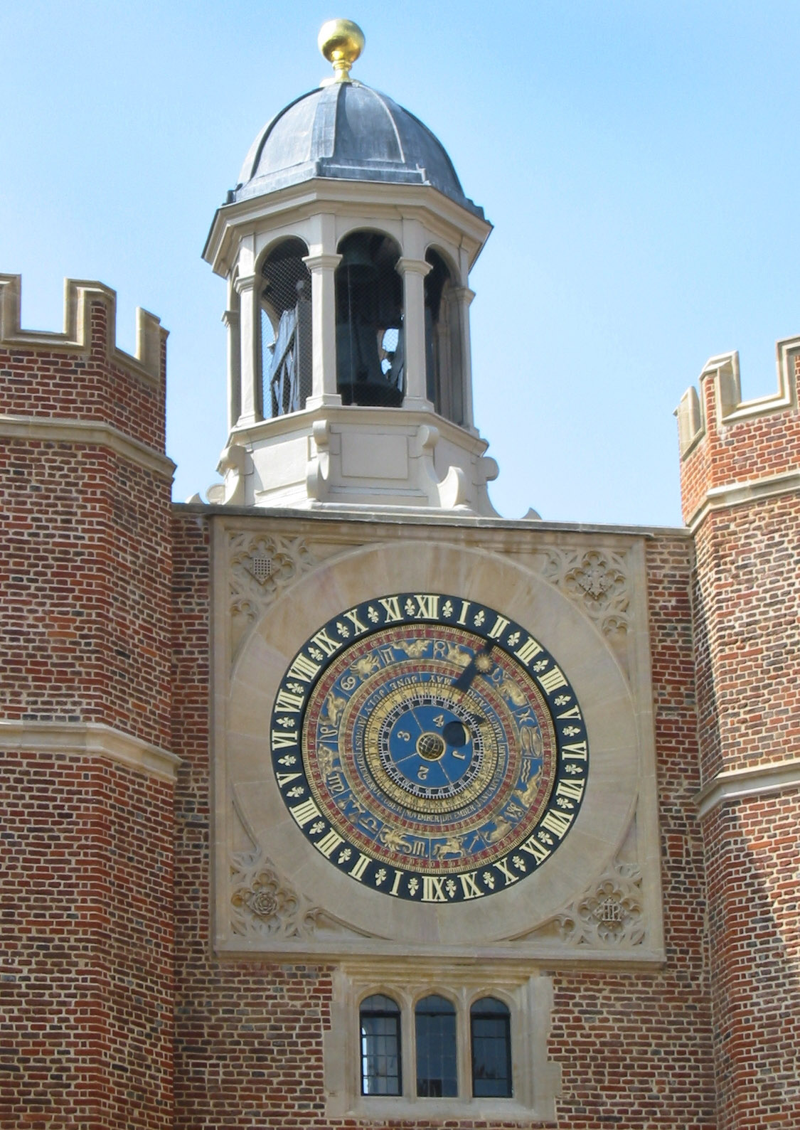 England’s King Henry VIII was a towering figure surrounded by drama and intrigue. One of Henry’s favorite residences was Hampton Court Palace. Originally built in 1514 by Cardinal Thomas Wolsey, Archbishop of York, the palace has a massive and unique astronomical clock mounted in the tower of what is now called Anne Boleyn’s Gate. With a dial more than 10 feet (3 m) in diameter, it was used for astronomical and astrological purposes and for navigation.