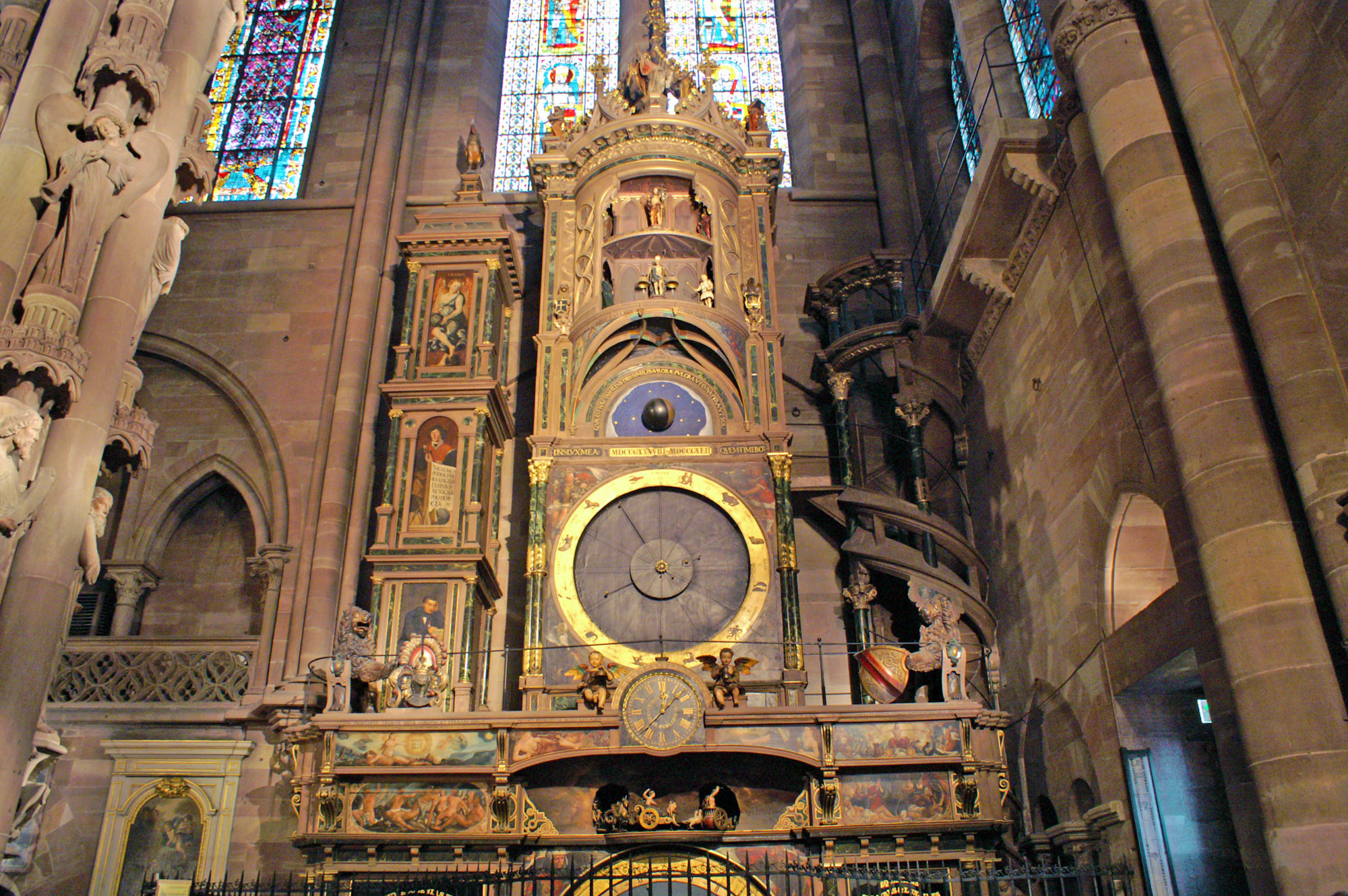 The current clock, which towers 59 feet (18 m) above the floor, is the third to grace the cathedral. The first clock was built in the 14th century. Little is known about this medieval clock other than it had a mechanical rooster that announced the hours. A second clock was built in the 16th century. It was adorned with an astrolabe dial, a Moon phase indicator, and calendar dials. It could even predict eclipses.