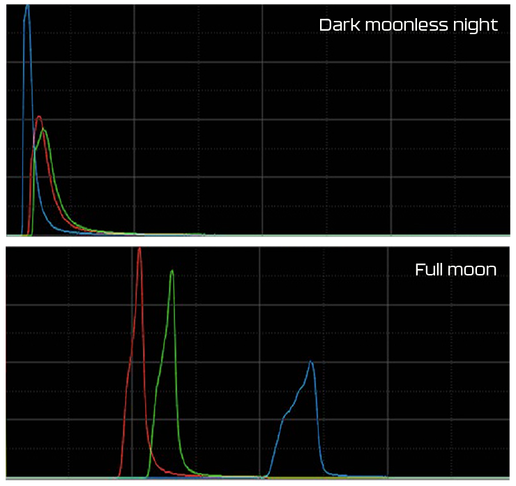A histogram of the same type of target in a Full Moon sky shows that the three colors are much farther apart, with the blue and green much brighter than the red. The blue histogram is also wider due to the contribution of the blue sky background. All three colors are much farther to the right, indicating a large luminance component to the sky. Finally, the overall noise level is higher during Full Moon.