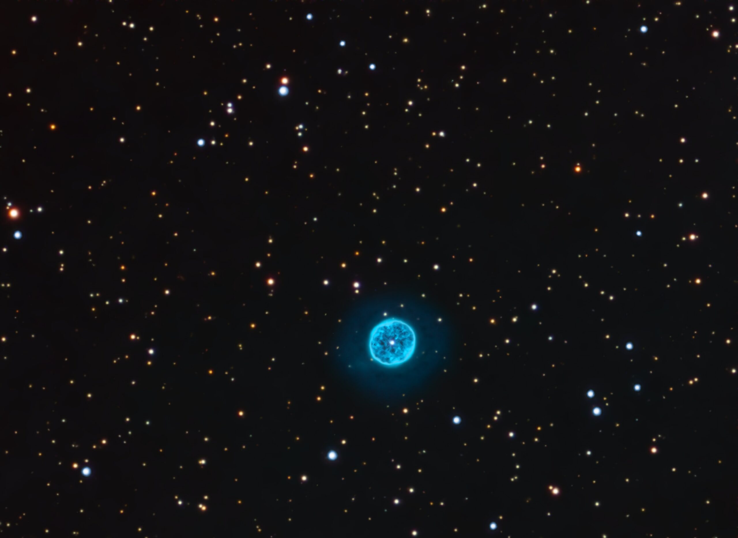 NGC 1501, often called the Oyster Nebula, is a planetary nebula around 5,600 light-years away in Camelopardalis, formed from the cast-off outer layers of a dying star. In photographs and large scopes, it has a blue hue, and is sometimes called the Blue Oyster Nebula. The imager gathered over 66 hours of Hα/OIII/RGB data with a 6.5-inch f/7 refractor, revealing its delicate outer structure.
