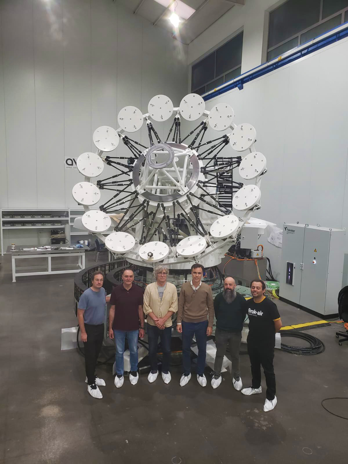 Several team members pose in front of the completed mechanical structure for the SELF telescope after it successfully passed structural testing in early November 2025. From left to right: Nicolas Lodieu, SELF project scientist; Ricardo Diego Garamendi, Added Value Industrial Engineering Solutions (AVS) president; Jeff Kuhn, LIOM project chair; Sergio Salta, AVS Earth Observation Project management; Jose Antonio González Olivera, TEKNIKER Automation and Control Unit researcher; Diego Tamayo Guzmán, control engineer. Credit: LIOM and the Instituto de Astrofísica de Canarias (IAC)
