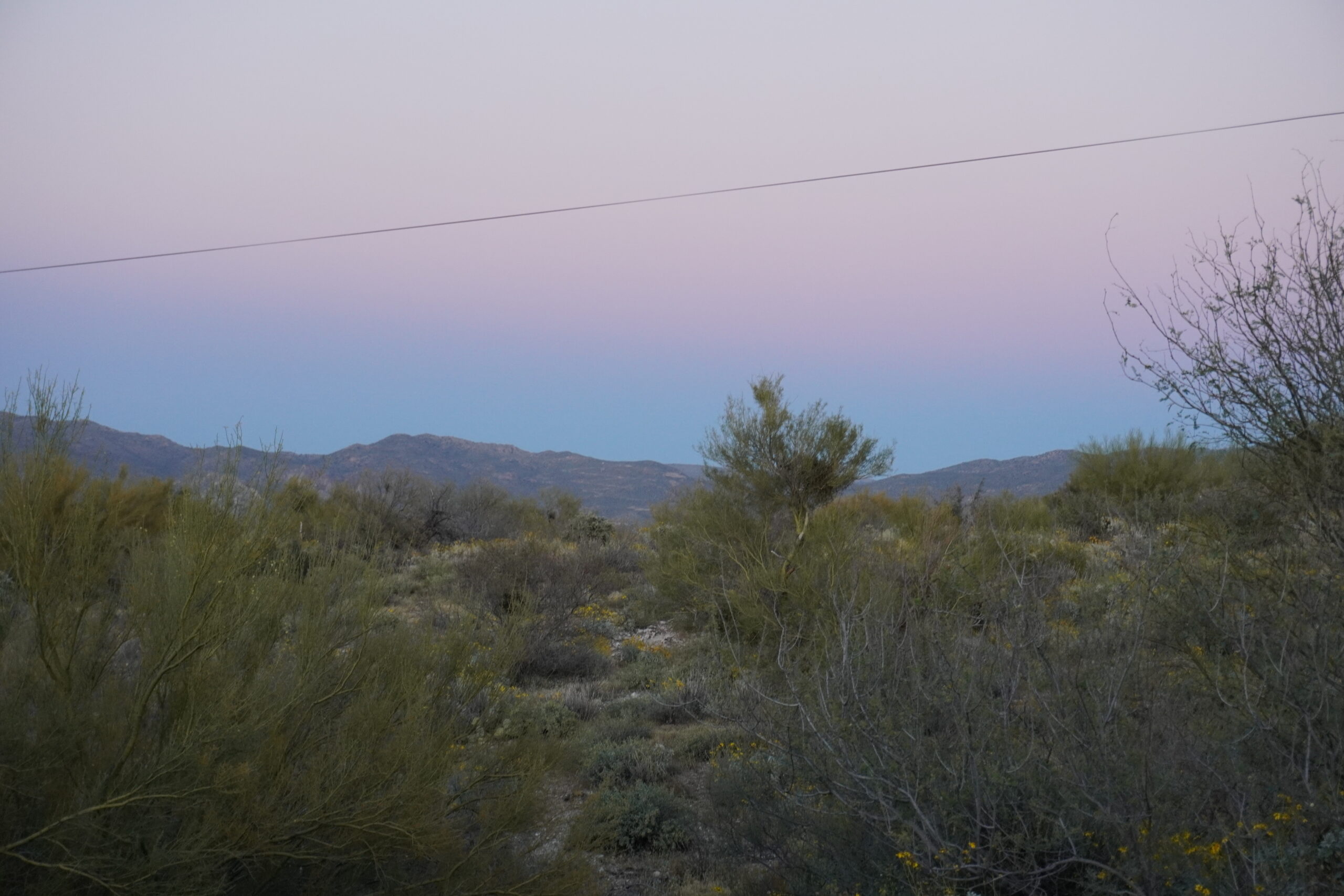 At night, wait at least 15 minutes after the Sun sets before you start looking. That will give the shadow enough time to rise about 4°. To visualize this angle, hold your hand out in front of you. The width of two of your fingers equals roughly 4°. At my location in Tucson, 4° doesn’t even make it to the top of the mountain range to the east, so I have to wait a bit longer.