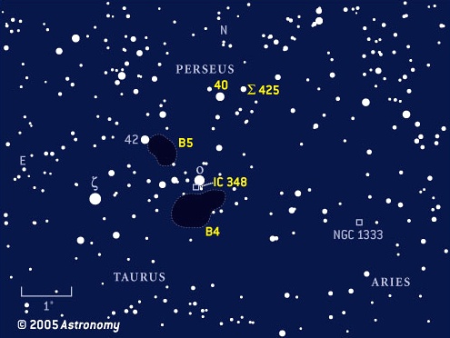 A couple degrees north of the IC 348 complex lies the double star 40 Persei. This very uneven pair sports components glowing at 5th and 10th magnitude. They serve as a departure point to another double, S425, which makes a nice test object for a 4-inch scope. Both stars glow at magnitude 7.6 with a mere 1.8″ separation, half the gap of summer’s famous Double Double in Lyra. For the best view in small instruments, pump up the power to 50x per inch of aperture.