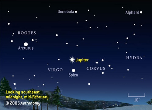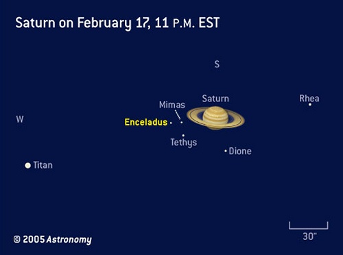 Higher magnification allows you to spot some of the moons closer to Saturn. Using a higher power reduces the glare from Saturn by spreading its light over a larger area. Mimas scampers around the planet in just 1 day and glows at magnitude 12.9. Enceladus completes an orbit every 1.4 days and glows at magnitude 11.7. Cassini makes its first close approach to Enceladus February 16/17. Images taken by the Voyager spacecraft revealed intriguing geological features on this moon, so planetary scientists eagerly await the first close-ups from Cassini’s more-powerful camera.