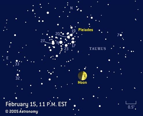 When the First Quarter Moon passes 1.2° south of the Pleiades the night of February 15/16, it marks the objects’ first close encounter since the early 1990s. The long drought stems from the Pleiades’ position relative to the lunar orbit. The cluster lies at a declination of 24°, on the northern part of the Moon’s orbital path. For the past dozen years, the Moon has been well south of the Pleiades each time it made its monthly pass.