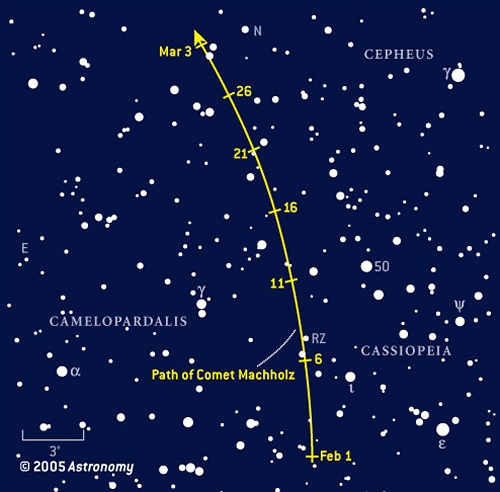 There are no easy star patterns to latch onto in this rather sparse area of northern Cassiopeia and Camelopardalis unless you’re a variable star observer. Comet Machholz should eclipse the well-known eclipsing binary RZ Cassiopeiae the evening of February 7. In an eclipsing binary system, the fainter star regularly moves in front of the brighter one, causing the pair to dim. In the case of RZ Cas, the pair fades from magnitude 6.2 to 7.7 in about 2.5 hours.