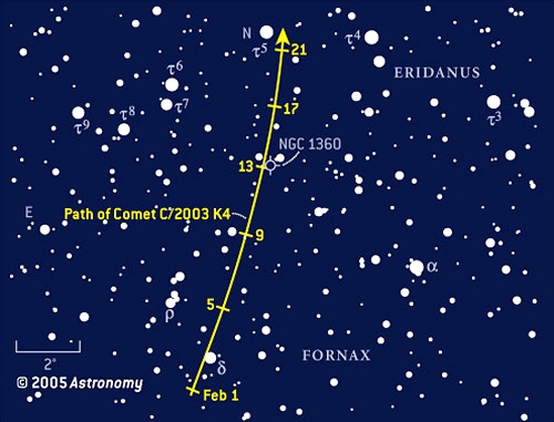 On the nights of February 13 and 14, C/2003 K4 lies less than an apparent Moon-width east of the large planetary nebula NGC 1360. Unfortunately, the nearby Moon will lighten the sky.