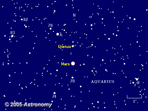 Mars spends mid-May in the company of Uranus. On the 15th, Uranus lies 1.2° north of the Red Planet. On the following few mornings, Uranus, Mars, and Lambda (l) Aquarii form a neat triangle. Now rising 3 hours before the Sun, Uranus reaches a decent altitude before twilight robs our view. It glows at magnitude 5.9 and reveals a 3.5″-diameter disk through a telescope.