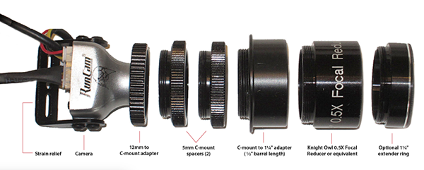 RunCam produces and sells the Night Eagle 2 on its own. The Night Eagle 2 Astro Edition, which contains the aforementioned enhancements, is available only through IOTA. That organization offers three different kits. For $79 plus shipping, you’ll receive just the camera with a wide-angle lens. For $149 plus shipping, you get the camera, plus all accessories (M12 to C adapter, 5mm spacer rings, camera C-mount to 1¼” adapter) except the 0.5x focal reducer. IOTA includes the Knight Owl 0.5 Focal Reducer and everything else for $179 plus shipping.