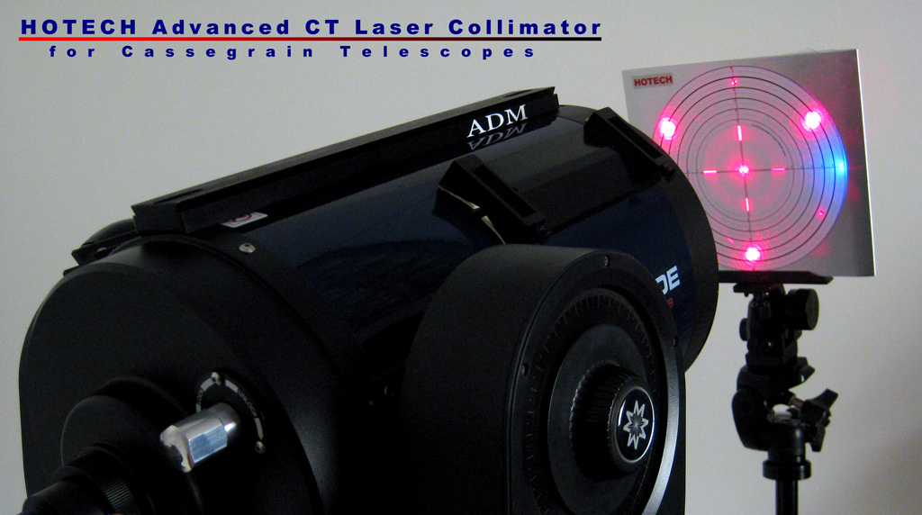 HOTECH’s Advanced CT Laser Collimator uses a flat mirror at the eyepiece location, a target placed in front of the telescope, and three lasers to align your Schmidt-Cassegrain telescope. You can collimate day or night, indoors or out.