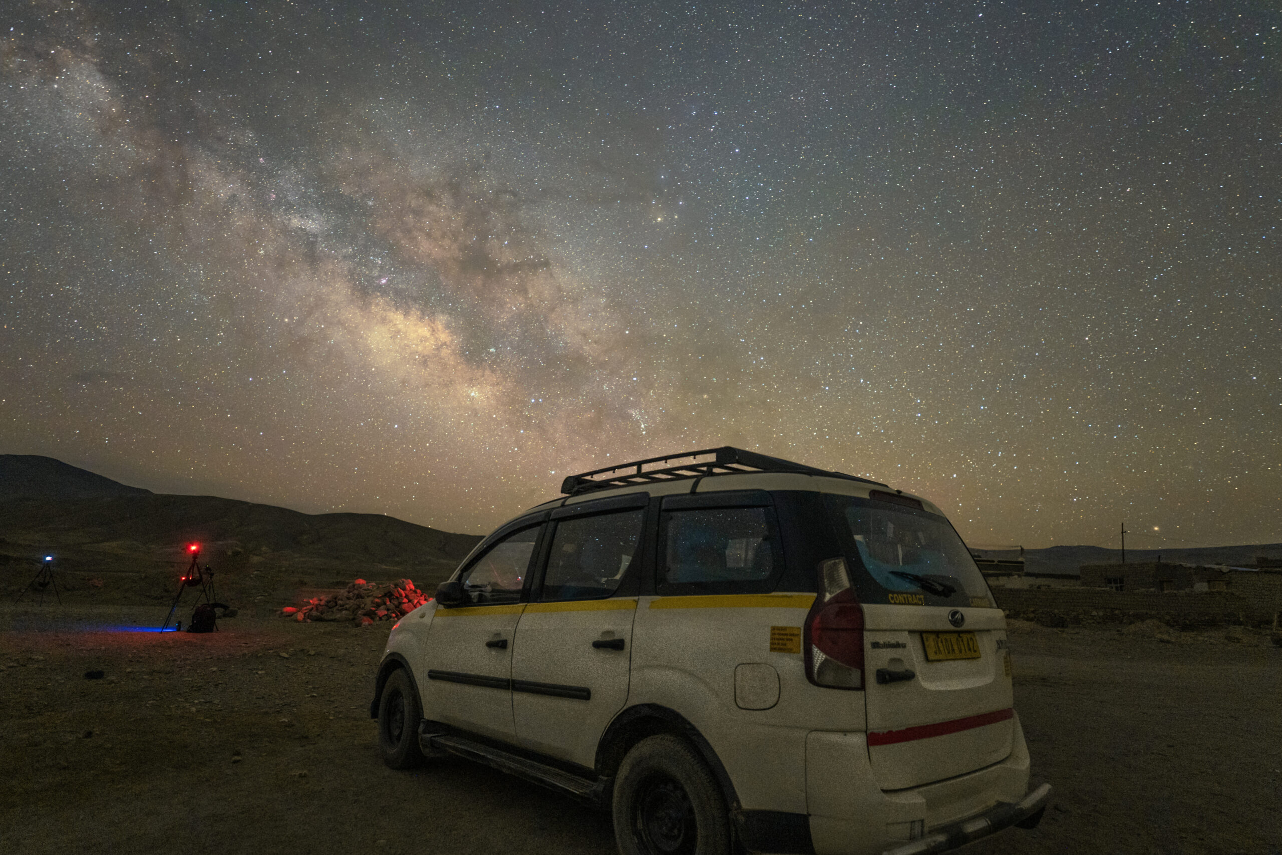 Dual processing involves processing the same image twice, each time focusing on different aspects (e.g., the sky and then the foreground) and blending the two versions for the final image. This shows the night sky from the banks of Pangong Lake in India.