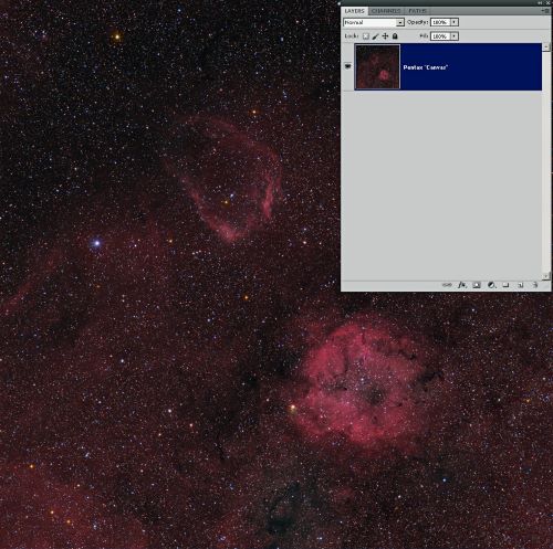 I won’t review all of the usual steps in image processing here, since these have been well covered in other articles on the subject. Rather, let’s focus on steps that are specific to building a wide-field composite. Above you’ll see a typical image from the Pentax 200mm/U16M setup, after calibration, stretching, and gradient removal, representing eight hours of an HαRGB exposure. It’s reassuring that the star colors are preserved without excessive blue fringing despite the achromatic lens system. Also preserved is the detail in the Hα components of the two main targets, as well as the intervening faint Hα signal that bathes this entire region (and which is often not appreciated when imaging a more limited field of view).