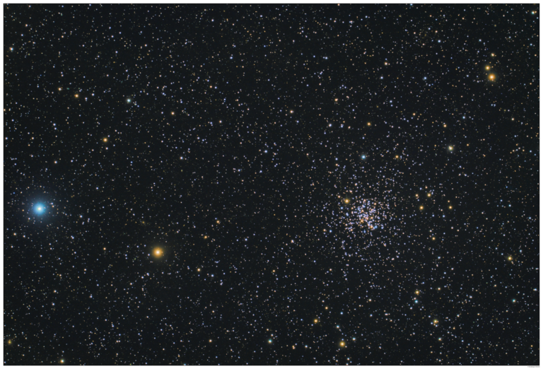 Smyth’s reference to “Sobieski” indicates that M11 lies in the constellation Scutum the Shield. Astronomers have estimated the mass of the cluster at between 4,000 and 11,000 solar masses. If the upper limit is correct, it would make it one of the most massive open clusters known. It lies some 6,100 light-years away and glows at magnitude 5.8. It appears to be 13′ in diameter, which corresponds (at the cluster’s distance) to a true diameter of 95 light-years.