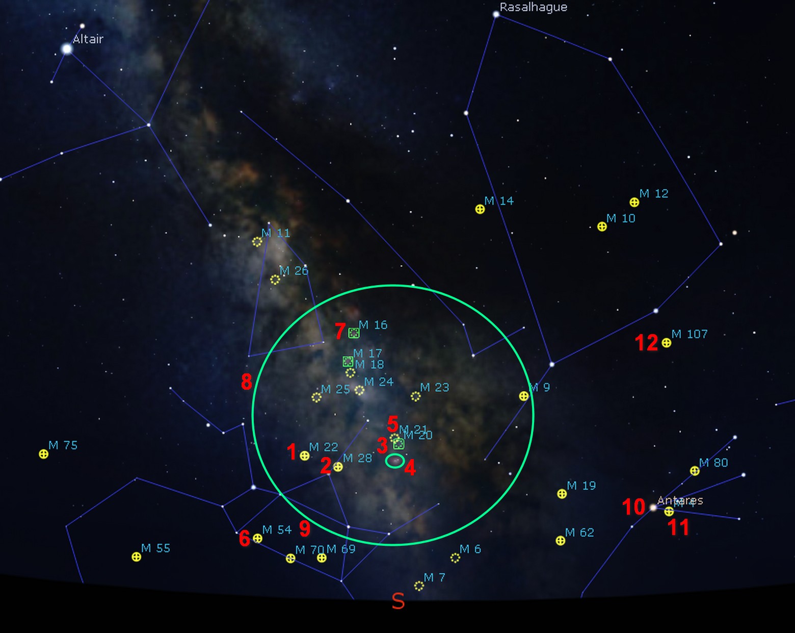 Frustratingly, for observers living at mid-northern latitudes (like me, writing this in the UK), a lot of the “good stuff” is so low in our sky that it is hard to see through all the haze and murk there. Celestial objects our southern friends see high in the sky are often hidden behind trees, buildings, and hills on our skyline. Consequently, many mid-northern observers don’t even try for famous objects such as the Lagoon and Trifid nebulae, or star clusters such as M4 and M22. And two of the most famous and striking constellations in the sky — Sagittarius and Scorpius — are hard to see too, for the same reasons. This is why many observers don’t even bother trying to look farther down the Milky Way than the star cluster M11 in Scutum: They think it’s just not worth it.