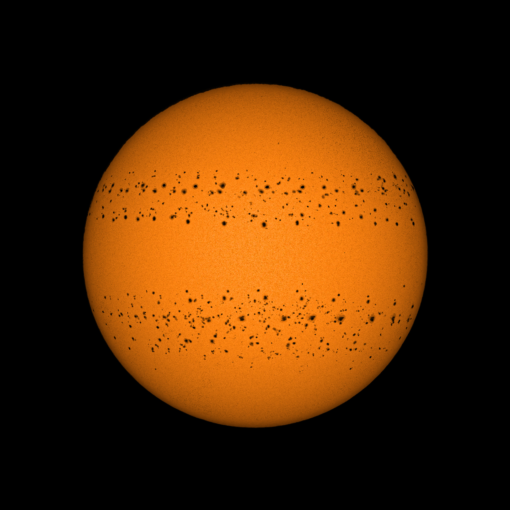 During processing, arrange the solar disks linearly. You’ll also need to rotate the images to counter the field rotation introduced on consecutive days. As a reference point, you can use images from NASA’s Solar Dynamics Observatory directly from its website (http://sdo.gsfc.nasa.gov). To create a composite image with data from multiple days, load all the images into Photoshop (or a similar program) as layers and choose the blend mode “Darken” for all of them.