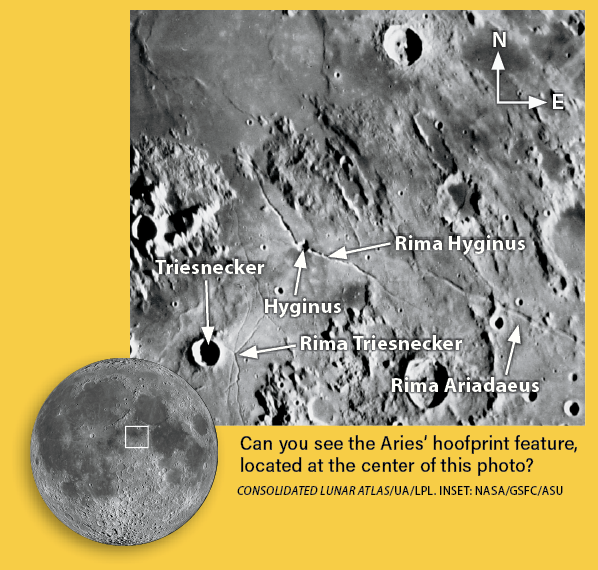 Aries the Ram certainly did not step on the Moon, but it’s fun to imagine the large hoofprint on the lunar surface could be his doing. On the evening of the 25th, the Sun has risen over the fascinating Hyginus, Triesnecker, and Ariadaeus rille complexes. In this area just north of the equator, what catches the eye most is a delightful hoofprint-shaped feature. The combination of brightly lit mountains and two deep channels of extra-dark lava create this striking play of light and shade. The dazzling array of craters farther south along the terminator vie for attention, but the cracks and shapes draw us back.