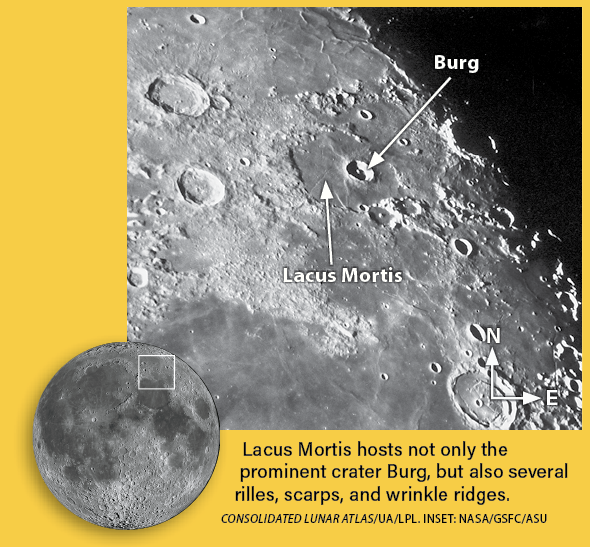 Lurching across the Lake of Death is best done in the late evening. On Nov. 9, the lunar night is about to overtake Lacus Mortis and the prominent crater Burg for two weeks. Take advantage of the season’s earlier sunsets and longer nights to observe the Moon past Full phase. Shining from the west instead of the east, the low Sun literally puts the terrain in a different light.
