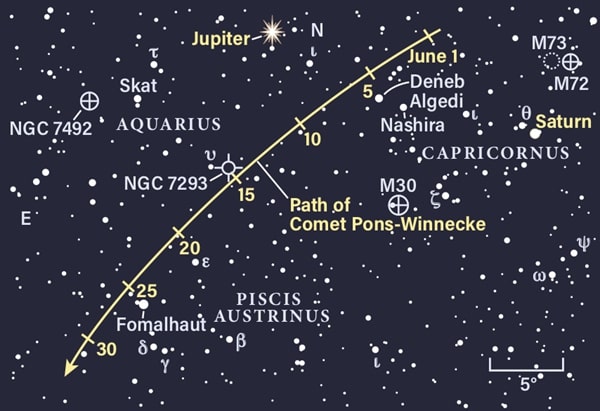 You’ll want to return to this region on the 15th, when Pons-Winnecke passes close to the Helix Nebula (NGC 7293). The nebula is currently 3.6° east-southeast of the comet’s position; Pons-Winnecke will draw closer and pass less than 1° south of the Helix before sunrise on Tuesday.