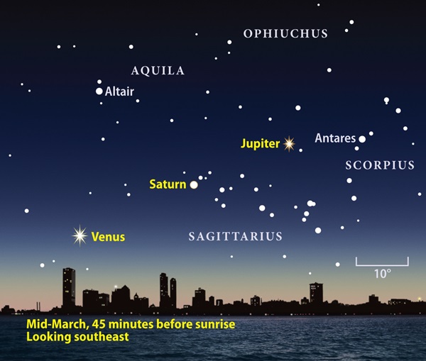 The three morning planets — Jupiter, Saturn, and Venus — appear equally spaced before dawn. Venus and Jupiter are the two brightest. (In fact, they are the two brightest points of light in the entire sky.) They lie 50° apart, while fainter Saturn lies exactly midway between them. If clouds interfere with your view this morning, don’t despair — to the naked eye, the alignment holds for a few days.