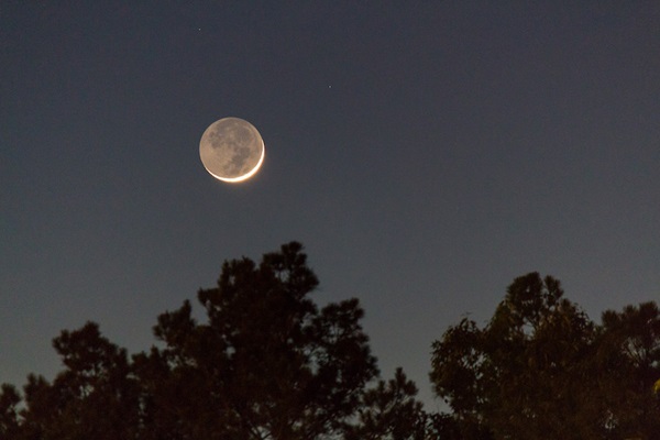 With an age of 4.5 billion years, “young” might not seem an appropriate word to describe our Moon. But tonight, you have an exceptional opportunity to see what astronomers call a “young Moon” — a slender crescent visible in the early evening sky. With New Moon having occurred just two days ago, only 5 percent of our satellite’s disk appears illuminated after sunset tonight. You can find the Moon about 10° above the western horizon an hour after sunset. You should notice an ashen light faintly illuminating the Moon’s dark side. This is “earthshine” — sunlight reflected by Earth that reaches the Moon and then reflects back to our waiting eyes. March is a particularly good month to view a young Moon. Luna gains altitude quickly from night to night because the ecliptic — the apparent path of the Sun across the sky that the Moon and planets follow closely — makes a steep angle to the western horizon after sunset. It causes the Moon to gain 10° of altitude each evening despite moving only 11° eastward relative to the Sun.