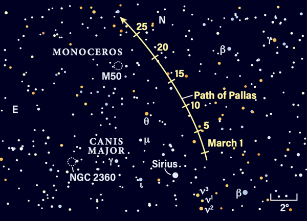 Let’s start with Pallas: Glowing at magnitude 8.2, you’ll find the large main-belt world just 4.3° north of 4th-magnitude Theta (θ) Canis Majoris. M50 lies just under 3° to Pallas’ east. This is a 6th-magnitude open cluster that spans some 16′; many observers comment that it has a vaguely heart-shaped appearance. And there’s more: About 3.5° to M50’s southeast is NGC 2353, a 7th-magnitude open cluster that’s a bit wider, some 20′ across.